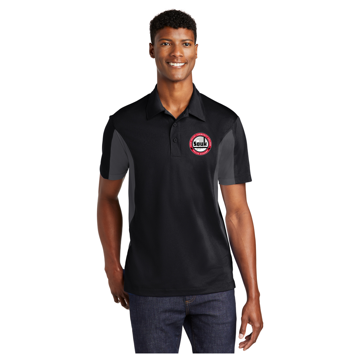 Smooth, snag-resistant and moisture-wicking micropique with colorblock panels.